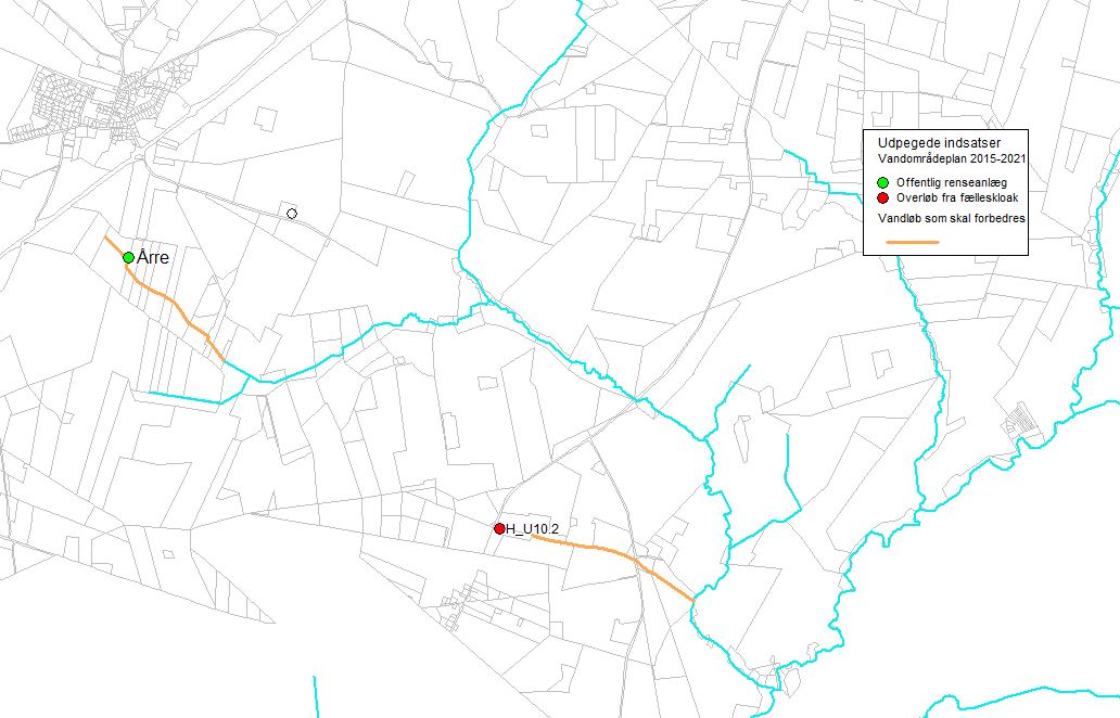 Overløbet fra pumpestationen i Hjortkær cirka tre km sydøst for Årre til Sneum Å er vist på kortudsnittet her.